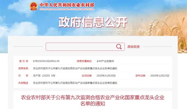 12月15日,農業(yè)農村部發(fā)布《關于公布第九次監(jiān)測合格農業(yè)產業(yè)化國家重點龍頭企業(yè)名單的通知》。